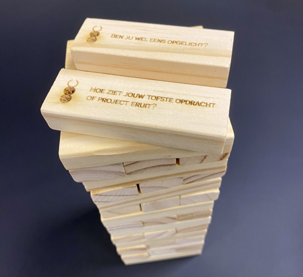 Creatiever kunnen we het niet maken, wel nog leuker. Weer andere vragen dan de Wie-Ben-Jij?-vragenkaarten en dan in een compleet andere vorm: een toren met op elk houten blokje een vraag. Teambuilding. Verrassende afwisseling voor je commissievergadering. Ook leuk voor aan de keukentafel thuis.
